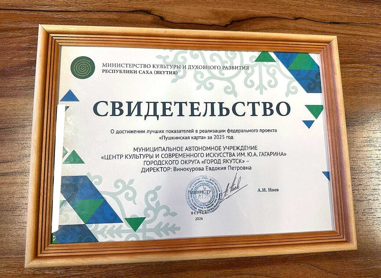 В ходе итогового собрания были вручены различные награды, в том числе за успехи в реализации федеральной программы «Пушкинская карта». Афанасий Иванович вручил свидетельство о лучших показателях директору нашего Центра Евдокии Петровне Винокуровой. Мы с гордостью сообщаем о получении награды нашим ЦКиСИ им. Ю.А. Гагарина за достижения в популяризации культурных мероприятий и вовлечении молодежи в искусство. Мы стали первыми среди культурно-досуговых учреждений Якутии по мероприятиям по Пушкинской карте!